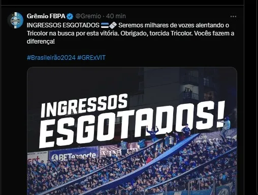 Ingressos esgotados para o duelo contra o Vitória
