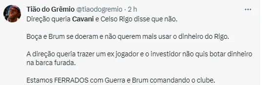 Acontece que em meio a muitos especulados, o treinador Renato Portaluppi negou, veementemente, que Cavani poderia chegar ao Imortal para essa temporada. “Não tem nenhuma possibilidade”, disse o comandante na ocasião.