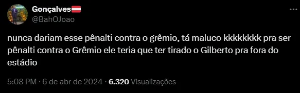 “Não é pênalti, é MUUUITO pênalti. Bizarro”, “Nunca dariam esse pênalti contra o grêmio, tá maluco kkkkkkkk pra ser pênalti contra o Grêmio ele teria que ter tirado o Gilberto pra fora do estádio” e “O VAR é o Lins, que todos sabem que é gremista declarado”, foram algumas declarações.