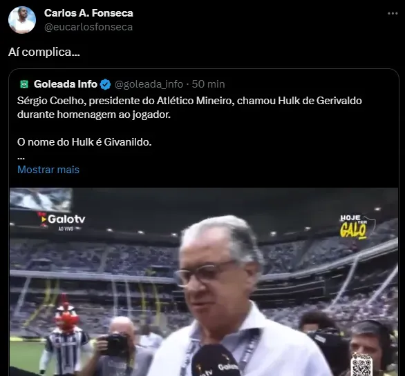 O que chamou atenção foi no momento da entrega da homenagem para o jogador, que recebeu uma placa das mãos do presidente Sérgio Coelho. Quando o mandatário foi falar o nome de batismo de Hulk, cometeu uma gafe.