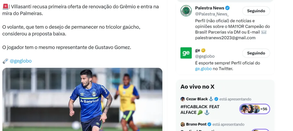 Villasanti chegou ao Grêmio na metade de 2021 e tem contrato válido até o fim da próxima temporada em Porto Alegre. Nesta quinta-feira (26), o setorista João Victor Teixeira, do Globo Esporte, informou que o camisa 20 recusou a primeira oferta da direção tricolor para estender seu vínculo. Ao mesmo tempo, há clubes interessados em sua contratação, como o Palmeiras, de Abel Ferreira.