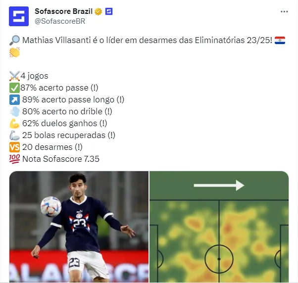 Com quatro jogos disputados com a seleção paraguaia, Villa realizou 20 desarmes, conforme informa o site especialista em estatísticas do futebol, Sofascore.