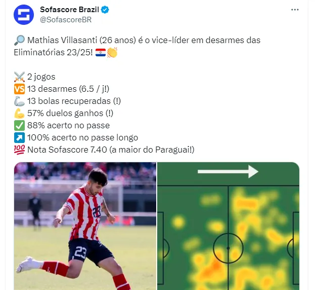 Isso porque, de acordo com o Sofascore, especialista em estatísticas sobre times e jogadores, Villasanti é o vice-líder em desarmes na atual edição das Eliminatórias. Em duas partidas disputadas, são 13 desarmes (6.5 de média por jogo), 13 bolas recuperadas, 57% dos duelos ganhos, 88% no acerto no passe e 100% no certo no passe longo, conseguindo uma nota 7.40, a maior do Paraguai. Para critério de comparação, Casemiro, do Brasil, tem seis desarmes.
