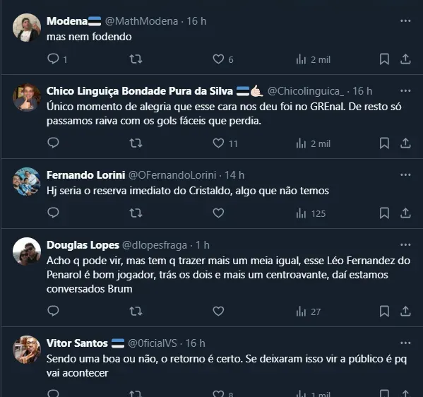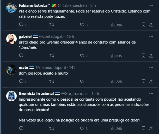 Além disso, ele disse que achou ter sido um erro ter aceitado deixar o Clube e não escondeu a vontade. Não à toa, causou uma enorme divisão entre os gremistas, que, na maioria, aceitariam o meia de volta.