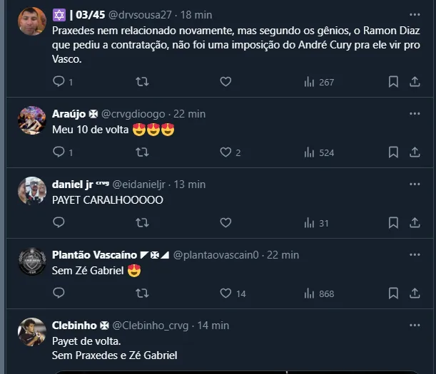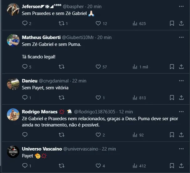 Vale lembrar que, de acordo com informações do portal SuperVasco, Zé Gabriel ficou de fora por opção do técnico Ramón Díaz, enquanto Praxedes ainda está em transição e deve retornar contra o Fortaleza.