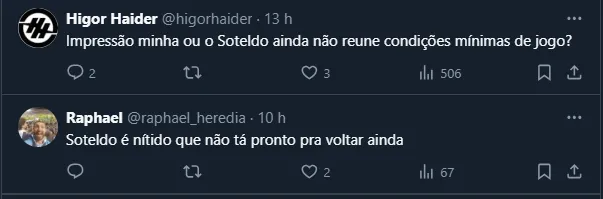 Dito isso, apesar do jogo não ter sido um primor técnico, foi importante em alguns aspectos, como na minutagem de Yeferson Soteldo. O venezuelano teve sua volta antecipada criticada por alguns torcedores, mas expôs o sentimento de tranquilidade para o duelo da próxima semana: