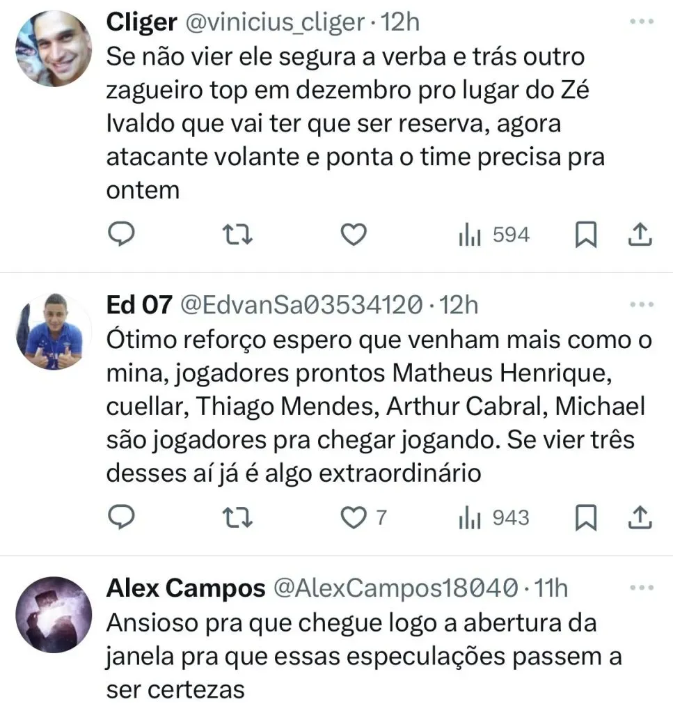 “Cruzeiro aguarda a definição de Yerry Mina se ele vem ou não para a América. O jogador tem desejo de continuar na Europa, mas é um cenário difícil. Voltando para o seu continente, dificilmente a Raposa perderia o zagueiro aqui no Brasil”, afirmou.