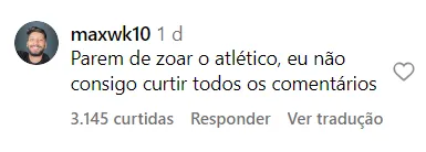 Na internet, os torcedores de vários clubes concordaram com a declaração de Zé Ivaldo e aproveitaram para tirar aquela casquinha do Atlético. “Torço para nenhum dos dois, mas errado ele não tá”, dizia um dos internautas.