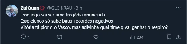 O Leão da Barra também não vive grande fase e sequer venceu no Brasileirão, mas a expectativa diante de equipe era menor, sem falar que o Rubro-Negro de Salvador ainda tem uma partida a menos e um bom retrospecto diante do rival.