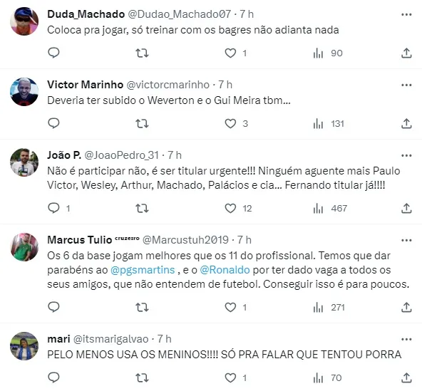 Vale destacar que os meninos acabaram de vencer a Copa do Brasil sub-20, onde bateram o Grêmio por 2 a 0. Fernando inclusive marcou um dos gols da Raposa, ajudando a equipe a conquistar um troféu inédito. É importante notar que o atacante de somente 18 anos é o artilheiro do time em sua categoria, tendo marcado 26 gols na atual temporada.