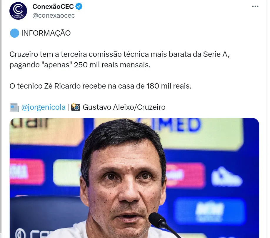 Após demitir o treinador Pepa, a SAF do Cruzeiro optou por contratar Zé Ricardo, que no futebol brasileiro passou por Flamengo, Vasco, Botafogo, Internacional e Fortaleza. O último trabalho do profissional foi no Shimizu S-Pulse, onde foi rebaixado para a segunda divisão do Campeonato do Japão e acabou demitido em abril.