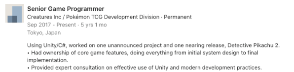 De acordo com usuários do fórum Famiboards, um dos desenvolvedores da Creatures Inc. postou em seu próprio LinkedIn que está envolvido no desenvolvimento de um jogo não-anunciado, que está com lançamento próximo e cita que é “Detective Pikachu 2”.