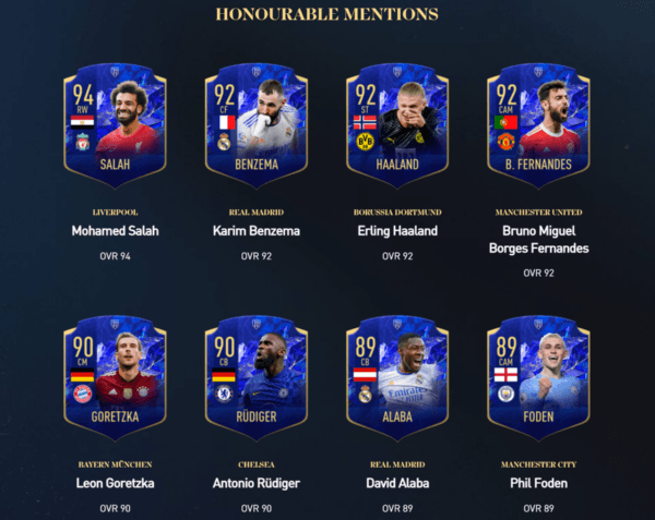 Nesta sexta-feira (28), FIFA 22 recebeu uma atualização na coleção da Seleção do Ano, em que 15 novas cartas serão adicionadas como Menções Honrosas, pois receberam muitos votos e não conseguiram uma vaga entre as 11 cartas especiais, alguns destaques são Mohamed Salah (Liverpool), Karim Benzema (Real Madrid) e Erling Haaland (Borussia Dortmund).