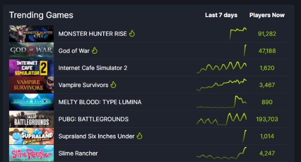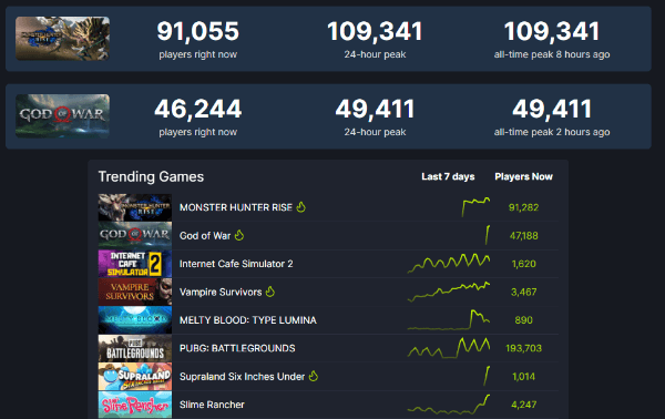 No Steam apenas mostra os games “Mais vendidos”, com God of War, Monster Hunter Rise e Red Dead Redemption 2 como os mais vendidos do momento. No entanto, de acordo com dados do SteamDB, que mostra números sobre os games, God of War está como líder de vendas, além de um pico de 49.411 jogadores simultâneos.