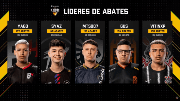 Já a disputa pelo MVP segue com Yago “Yago” dos Santos, da B4 Esports, na liderança com 157 abates, enquanto Gabriel “Syaz” Vasconcelos segue com 148 abates e o Mateus “Mts007” da Silva, da Team Liquid, com 139 abates.