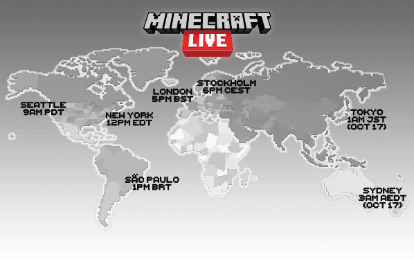 A Mojang anunciou que realizará o evento Minecraft Live em 16 de outubro, trazendo novidades do game Minecraft, além de entrevistas com convidados e aparição de rostos familiares da desenvolvedora e também da comunidade, pois streamers e influencers também estarão presentes durante a transmissão.