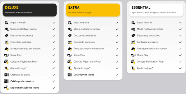 Por fim, a última disponível no Brasil é a PS Plus Deluxe, que contém os benefícios da PS Plus Extra e Essencial, mas oferece um acervo expandido de jogos no catálogo, com a adição de games clássicos de PlayStation 2 e PSP, além dos games de PS4 e PS5 que já estão na assinatura Extra. A assinatura Deluxe está por R$ 59,90 por mês ou R$ 389,90 no pacote de 12 meses (R$ 32,49 por mês).