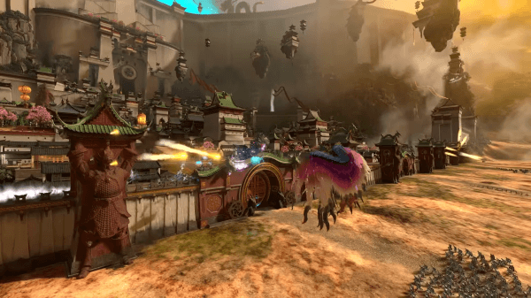 A batalha do trailer acontece no Grande Bastião, símbolo perene de resistência que há milênios protege a Grande Cathay da fúria dos Deuses do Caos – incluindo Tzeentch. Ao usar esse recurso para defender Grande Cathay, o jogador poderá construir torres de projéteis e barricadas no interior do povoado para inibir o avanço na cidade. Já Tzeentch consegue usar seus recursos para inibir as defesas e facilitar o combate de suas tropas, como visto na fácil infiltração do trailer.