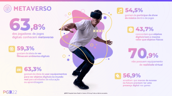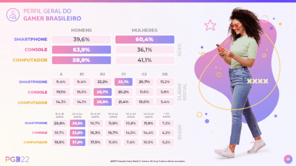 Outros dados importantes são sobre o público, no qual 51% são mulheres, que negros prevalecem como maioria étnica entre os jogadores brasileiros com 49,4% na soma entre pardos e pretos, além de que 62,7% dos jogadores são da classe média, seguido da classe A (13,5%), da classe média alta (12,3%) e das classes D e E (11,6%). Sobre as novidades de tecnologia, NFT (Token Não Fungível) é conhecido por 49,2% dos jogadores e 63,8% já ouviram falar em metaverso.