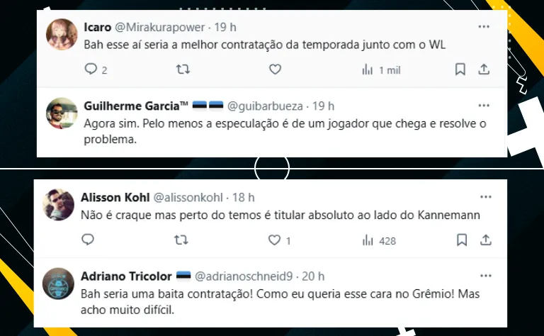 Por fim, embora a negociação seja bastante complicada, os torcedores do Imortal se mostraram contentes com o nome. Vale mencionar que Jemerson talvez venha sendo o nome mais questionável do elenco. Confira a repercussão envolvendo o nome: