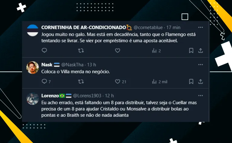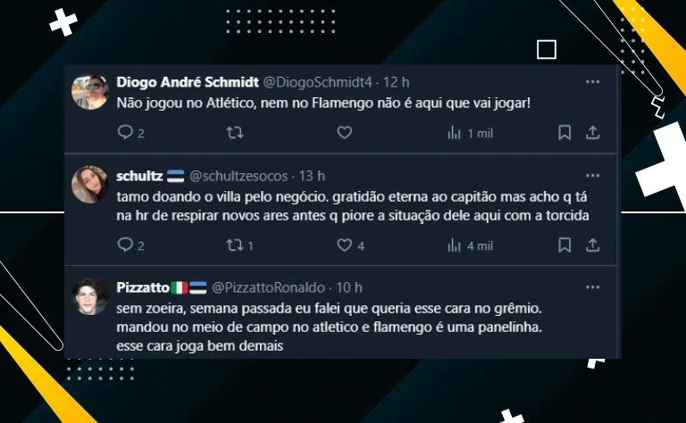 Por fim, mesmo que nenhuma oferta oficial tenha sido feita, o tema causou frisson entre os gremistas e a situação do volante causou divisão. Enquanto muitos aprovaram seu nome para o time de Quinteros, outros descartaram. Confira: