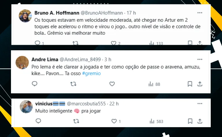 Por fim, ansiosos pela reestreia de Arthur com a camisa do Imortal, inúmeros gremistas foram até as redes sociais repercutir a qualidade técnica do meio-campista no vídeo publicado. Confira:
