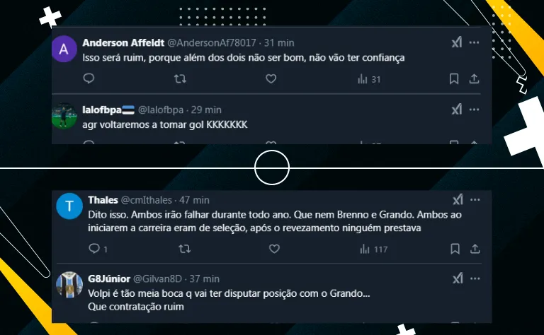Entretanto, a torcida do Imortal não gostou nada da decisão do comandante, já que viveu algo parecido em 2021. Na época, Brenno e Gabriel Grando se alternaram ao longo do ano e nenhum deles se firmou.