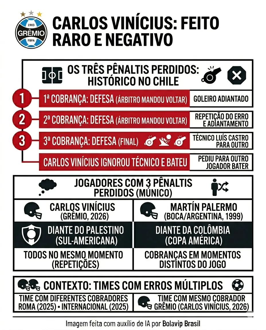 Carlos Vinícius protagonizou nesta quarta (29) um dos episódios mais raros do futebol mundial. O atacante do Grêmio perdeu três pênaltis na mesma partida, diante do Palestino, no Chile, pela Sul-Americana.
