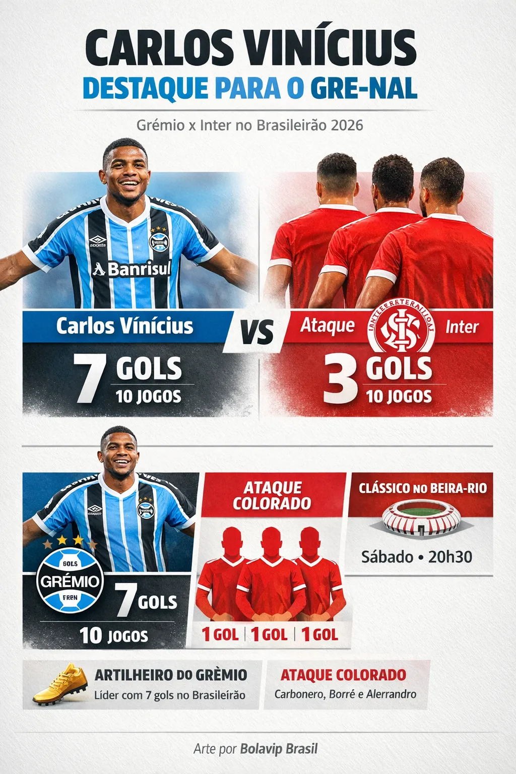 O Grêmio chega para o clássico Grenal de número 452 com um destaque que chama atenção: Carlos Vinícius tem mais gols do que todos os atacantes do Internacional somados no Brasileirão 2026. O centroavante vive grande fase e lidera o setor ofensivo com números impressionantes.