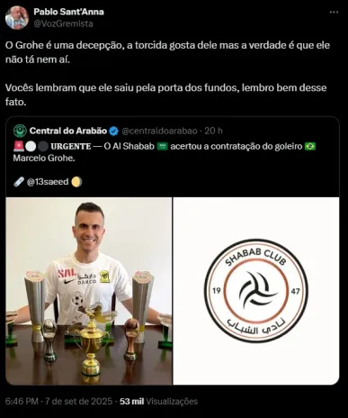 Mesmo assim, sua escolha de seguir no futebol árabe não agradou parte da torcida, que sonhava com um retorno em 2025. A contratação movimentou as redes sociais. Enquanto alguns gremistas lamentaram que Grohe não tenha voltado ao clube, outros defenderam a decisão do goleiro de buscar novos desafios.