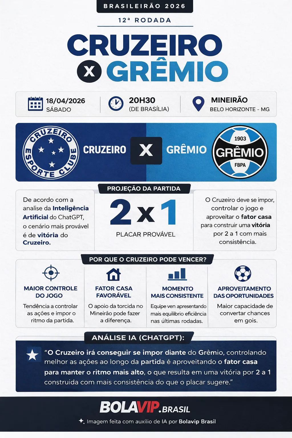 “O Cruzeiro irá conseguir se impor diante do Grêmio, controlando melhor as ações ao longo da partida e aproveitando o fator casa para manter o ritmo mais alto, o que resulta em uma vitória por 2 a 1 construída com mais consistência do que o placar sugere”, cravou a IA.
