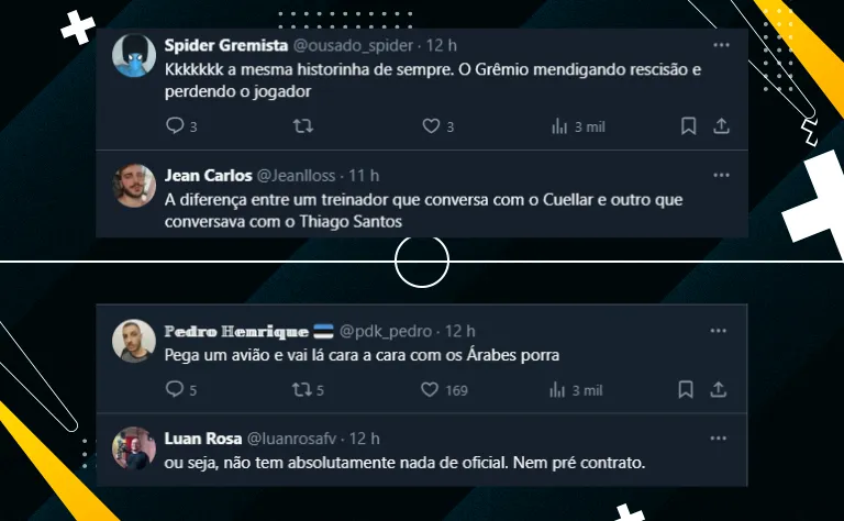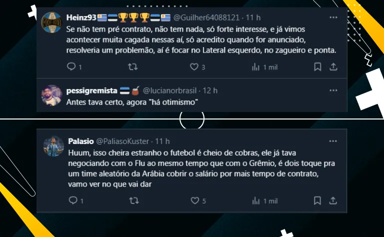 Por fim, embora seja um jogador experiente e disputado no mercado, o torcedor do Grêmio ficou dividido. Afinal, o fato de ter um acordo fechado apenas com o jogador é algo que deixa a torcida ressabiada, conforme você pode conferir abaixo: