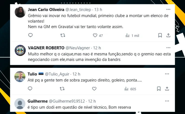 Por fim, com a divulgação do interesse gremista no jogador, inúmeros torcedores se manifestaram na web sobre a possível contratação. Veja abaixo a divisão clara entre torcedores do Grêmio nas redes: