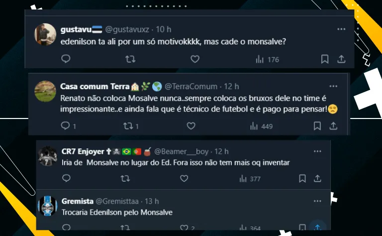 Entretanto, uma das principais críticas do torcedor do Imortal foi a ausência de Miguel Monsalve. O colombiano de 20 anos foi preterido por Edenílson e causou enorme incômodo nos gremistas.