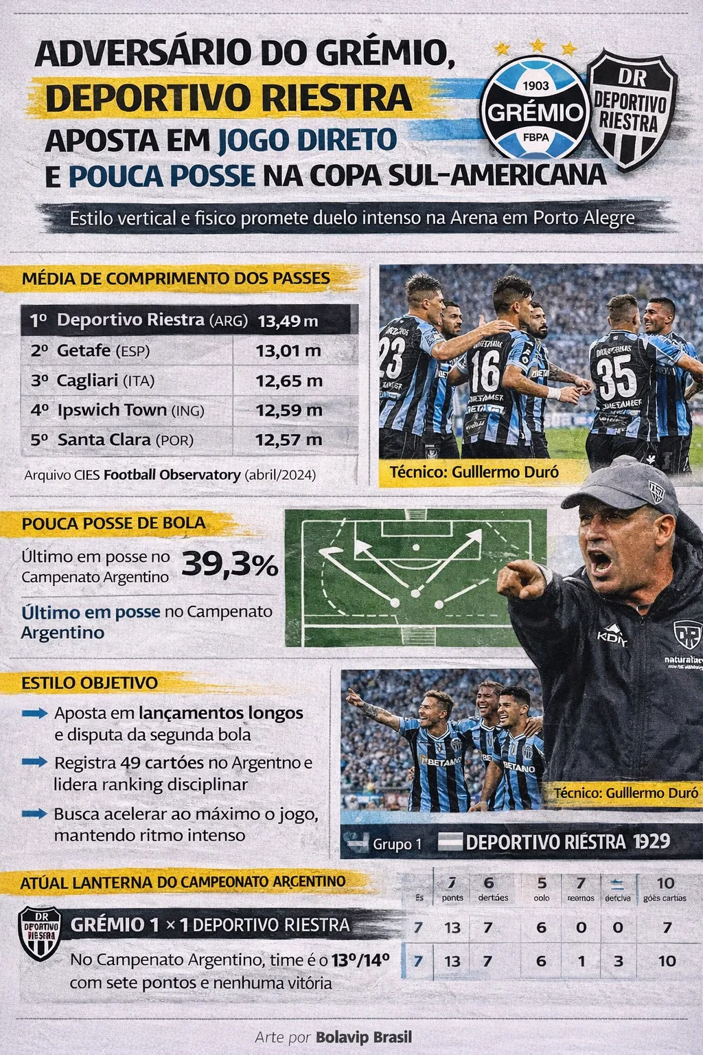 Levantamento do CIES Football Observatory indica que o clube argentino possui média de passes de 13,49 metros, a maior do mundo. Na prática, isso representa um modelo que praticamente dispensa trocas curtas e construção gradual. O Riestra aposta em um jogo direto, quase como regra.