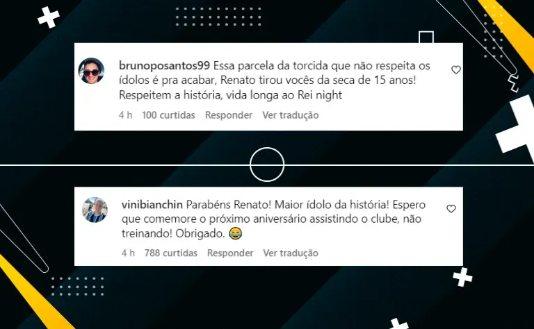 Outro pontuou: “Essa parcela da torcida que não respeita os ídolos é para acabar. Renato tirou vocês da seca de 15 anos! Respeitem a história, vida longa ao Rei Night”.