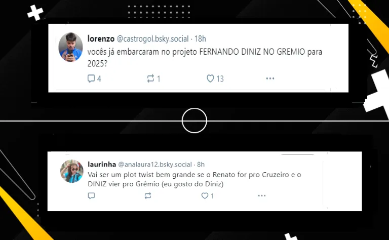 “Queremos Diniz no Grêmio”, disse um torcedor na rede social. Outra torcedora foi na mesma linha: “Vai ser um plot twist bem grande se o Renato for para o Cruzeiro e o Diniz vier pro Grêmio”, completou.
