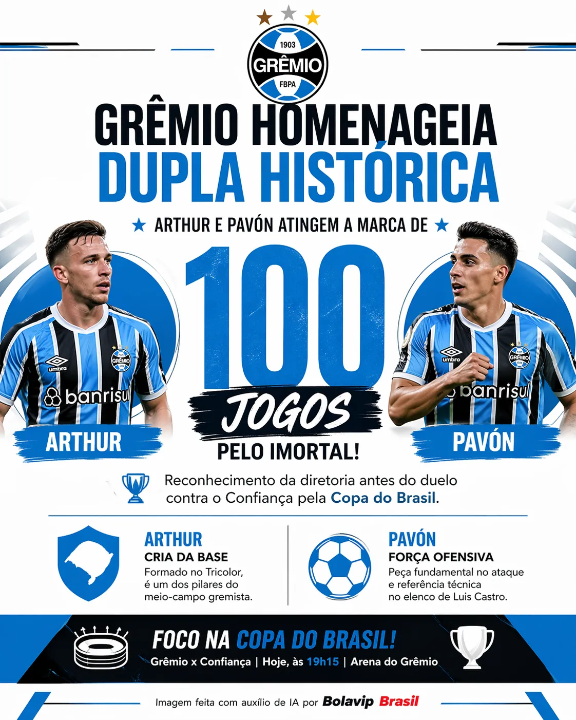 O Grêmio está preparando uma ação para homenagear Arthur e Pavon, dois jogadores importantíssimos para o Imortal. Isso porque ambos completaram, contra o Cruzeiro, 100 jogos pela equipe.
