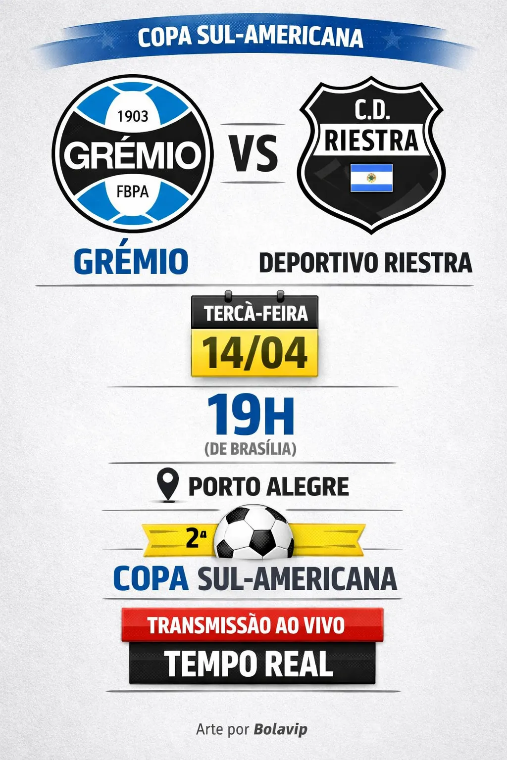 Nesta terça-feira (14), o Grêmio volta a entrar em campo pela 2ª rodada da Copa Sul-Americana. Jogando em Porto Alegre, o Imortal irá receber o Deportivo Riestra, da Argentina, a partir das 19h (de Brasília). A partida será transmitida pelo Bolavip Brasil em tempo real.