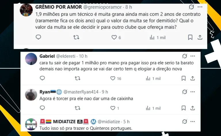 Por último, enquanto alguns torcedores do Imortal manifestaram a alegria pelo Tricolor dos Pampas estar contratando um nome de peso, vários torcedores criticaram o alto número dos valores na web. Confira:
