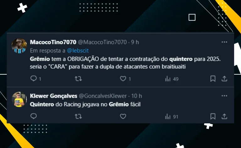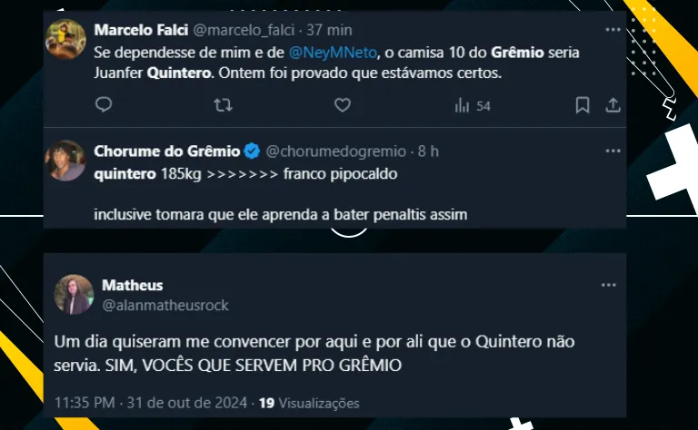 No momento, o contrato de Quintero com o Racing (ARG) vai até dezembro de 2026 e o atleta é avaliado em pouco mais de R$ 15 milhões, segundo o Transfermarkt. Confira as reações dos gremistas: