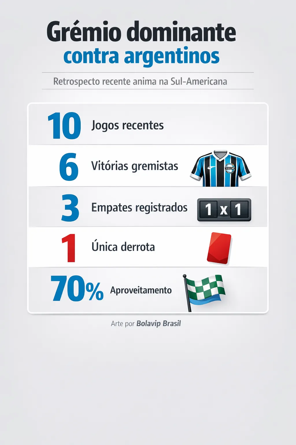 Para conseguir seu primeiro triunfo na competição, o Imortal se apoia no bom retrospecto recente atuando em casa diante de equipes argentinas. Nos últimos dez duelos, foram seis vitórias do Tricolor, três empates e apenas uma derrota, com 70% de aproveitamento no período.
