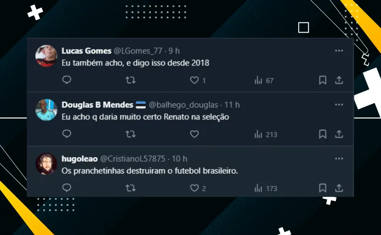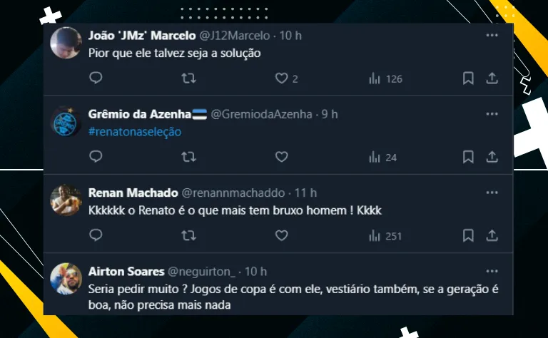 Por fim, se parte dos gremistas não aprovam o nome de Renato, outras torcidas defendem sua contratação, principalmente caso a opção de trazer um estrangeiro esteja praticamente descartada. Veja os comentários:
