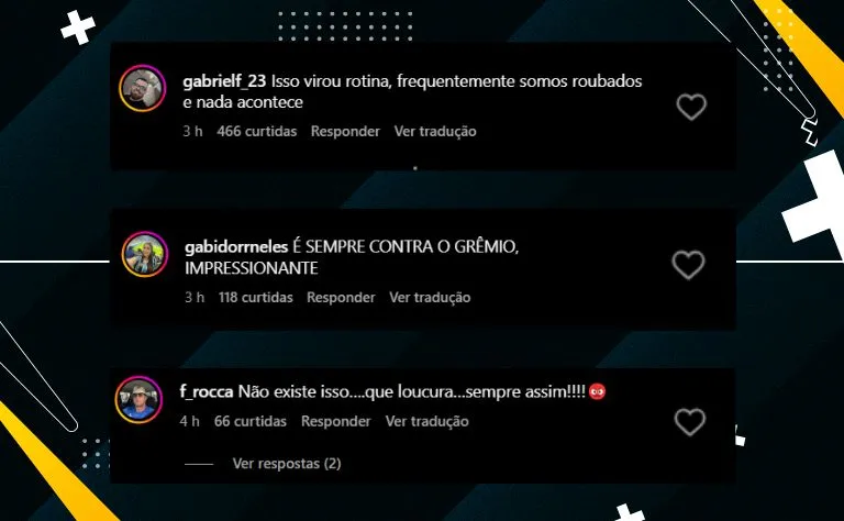 Os comentários refletiram um sentimento coletivo de indignação: “Tragam árbitros do exterior! Pelo amor de Deus!”, disse outro fã do clube. Vários torcedores expressaram sua frustração com a frase “É SEMPRE CONTRA O GRÊMIO, IMPRESSIONANTE”, destacando a percepção de que decisões controversas têm se repetido contra a equipe.