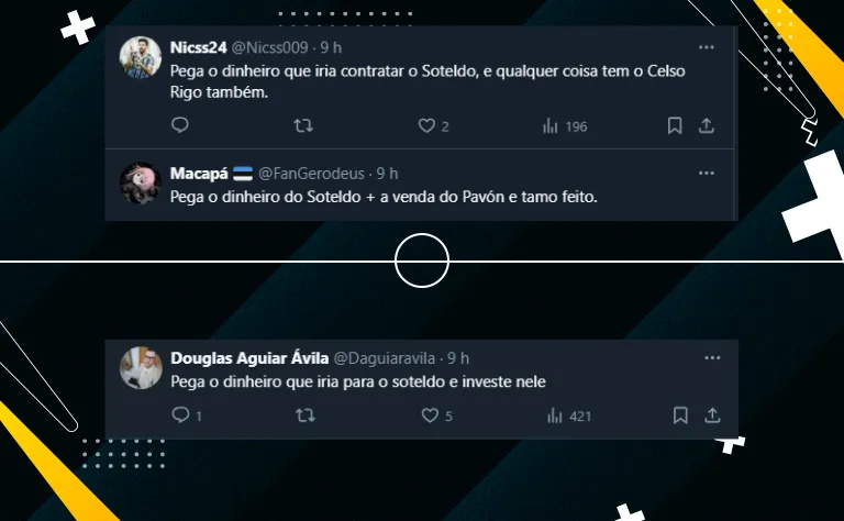 Inclusive, parte da torcida resolveu dar uma sugestão a Alberto Guerra e tratou de propor uma estratégia para contratar Guedes. A ideia seria vender Pavón e não efetivar a compra de Soteldo, o que aliviaria bem o caixa.
