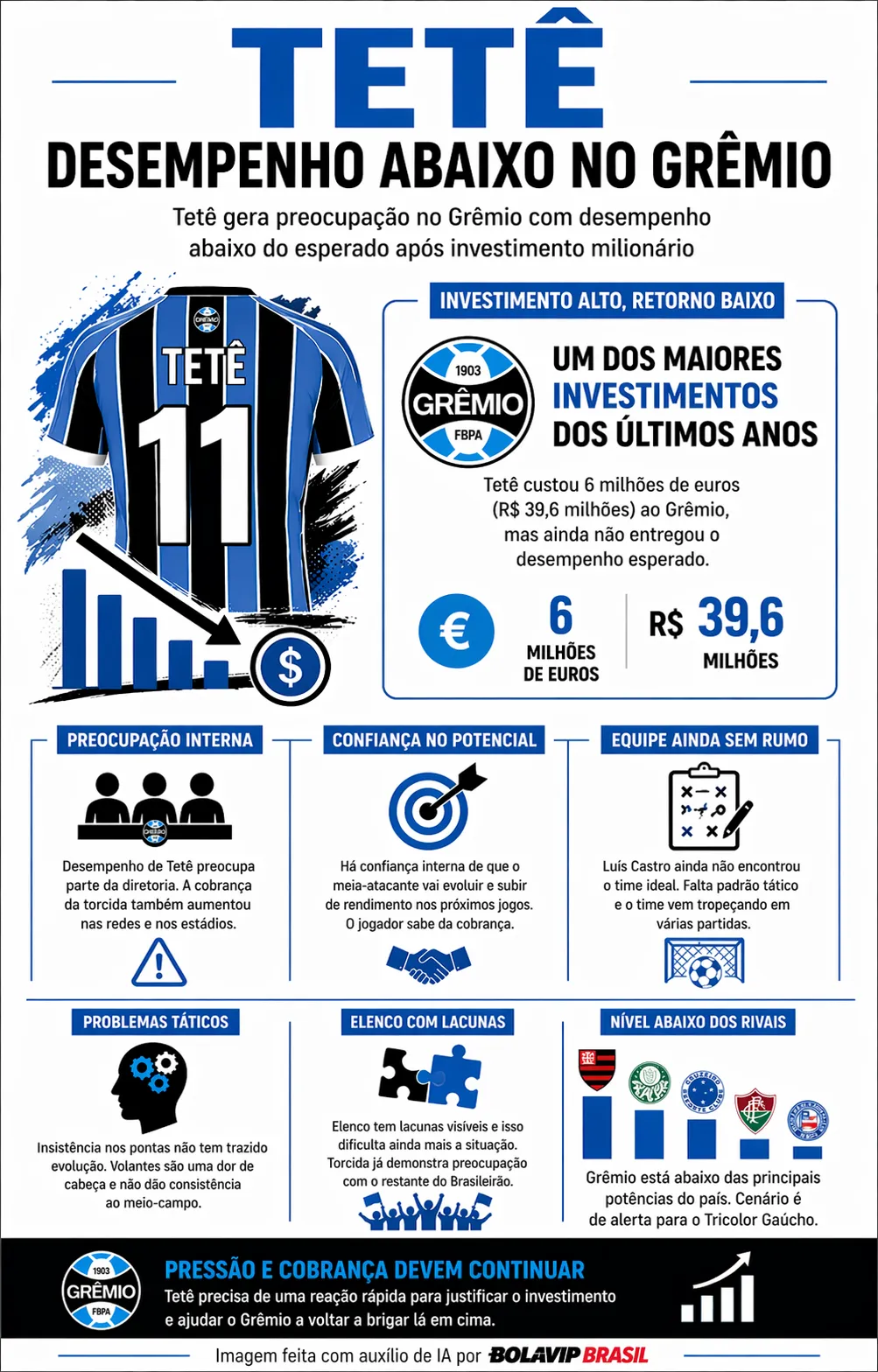 Tetê foi um grande investimento que ainda não deu o retorno esperado no Grêmio. Até por isso, o jogador já vem recebendo uma cobrança de parte da torcida nas redes sociais e nos estádios.