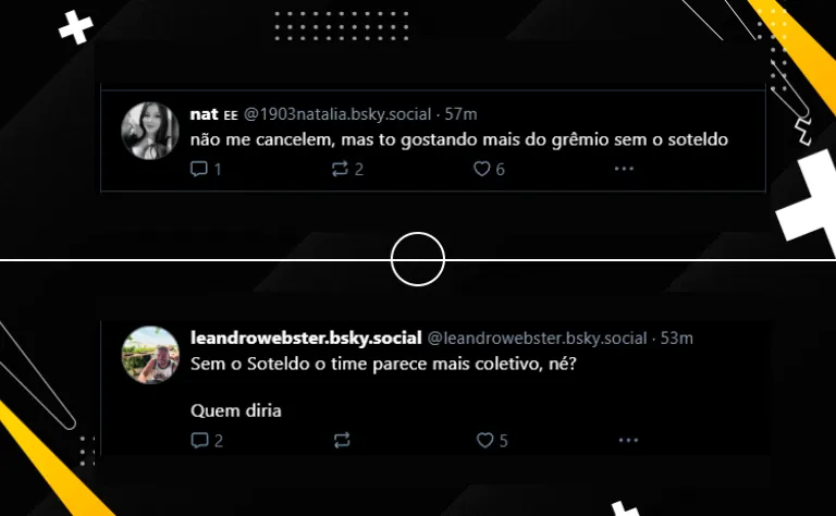 “Eu estou gostando deste Grêmio sem o Soteldo, parece um time mais coletivo, faz bem aos jogadores“. Outro torcedor também seguiu a mesma linha de raciocínio: “vocês concordam que nesse esquema sem o Soteldo o grêmio tá jogando bem?“