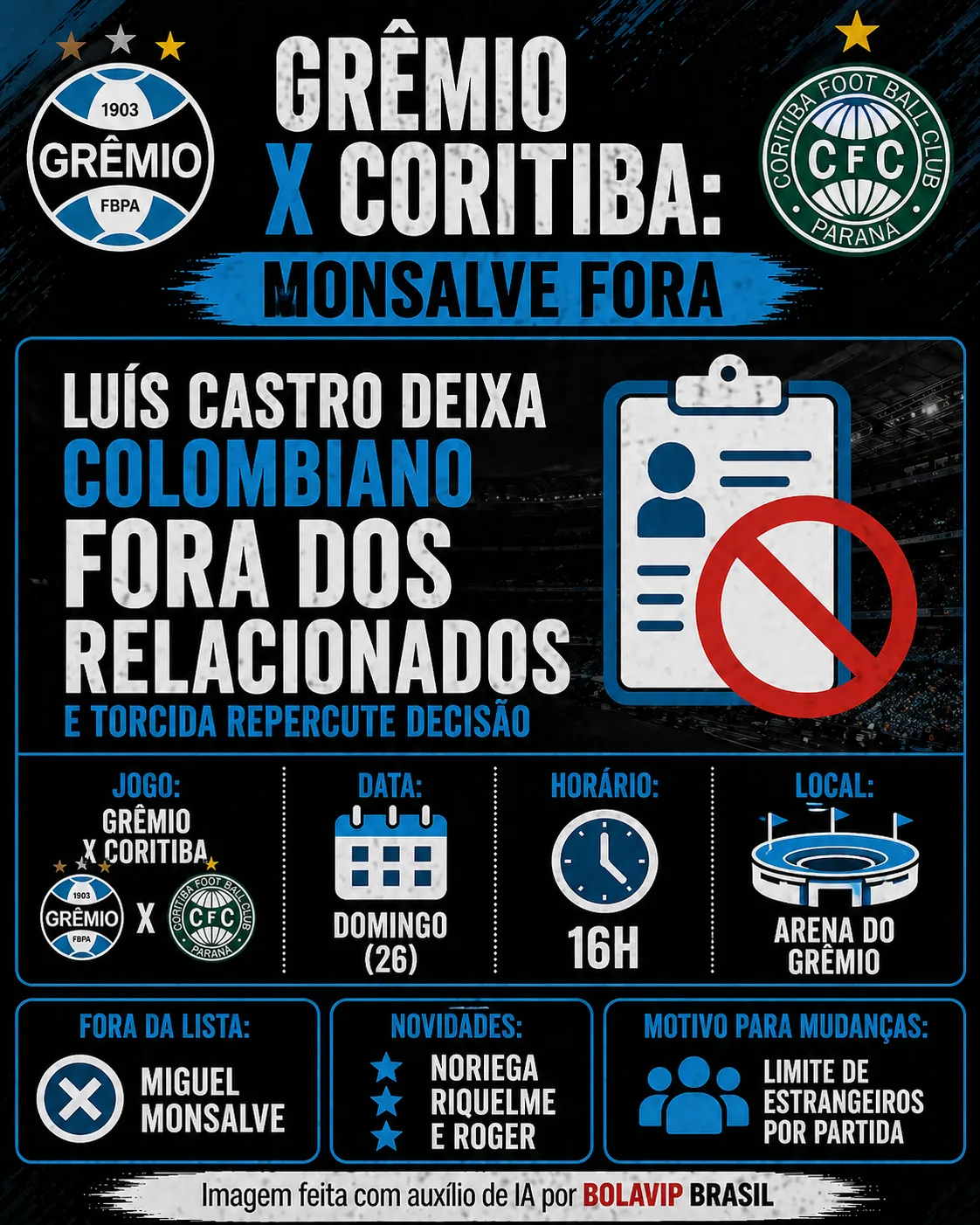 Os outros dois são os jovens Riquelme e Roger, que entraram nos relacionados muito por conta do limite de estrangeiros por partida. A bola vai rolar hoje (26), às 16 horas, na Arena do Grêmio.