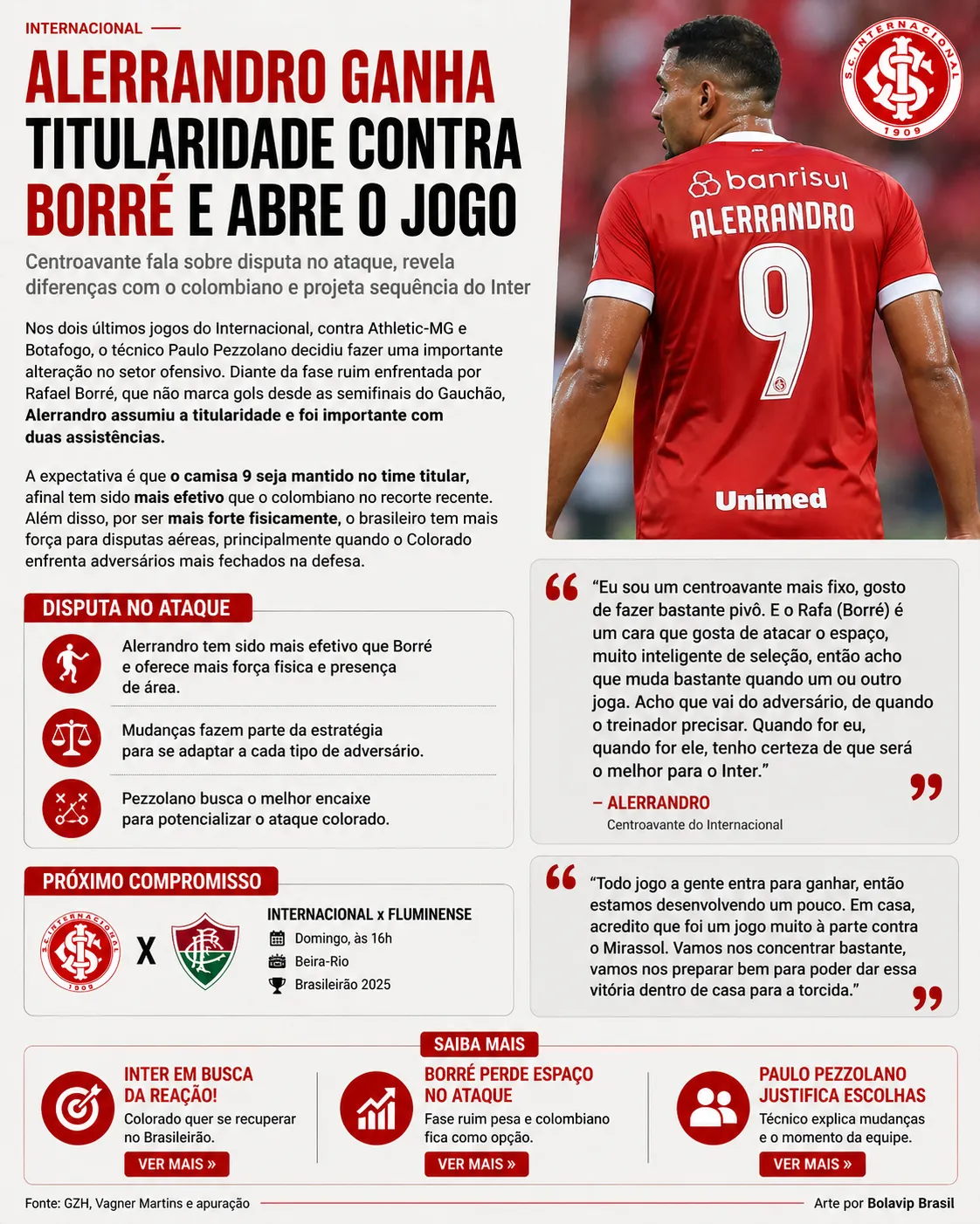 O Internacional vive um momento de ajustes no setor ofensivo e uma mudança importante já ganhou força nas últimas partidas. Com a fase irregular de Rafael Borré, o técnico Paulo Pezzolano optou por dar sequência a Alerrandro, que assumiu a titularidade e respondeu dentro de campo.