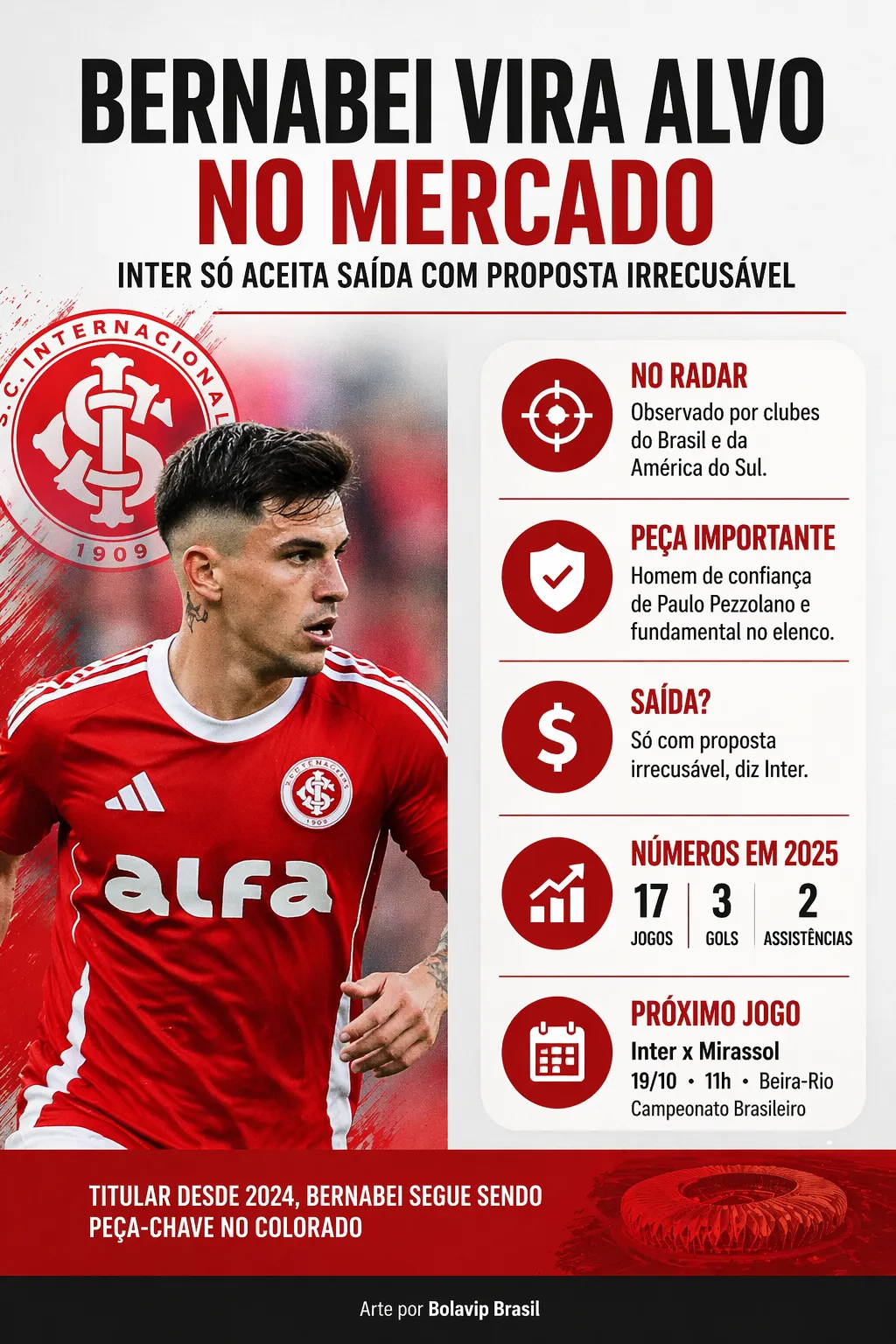 Segundo o comunicador, Bernabei vem sendo monitorado por diversos scouts e tem números que chamam atenção. Mesmo assim, o clube gaúcho adota postura firme nos bastidores e não pretende facilitar uma eventual negociação.